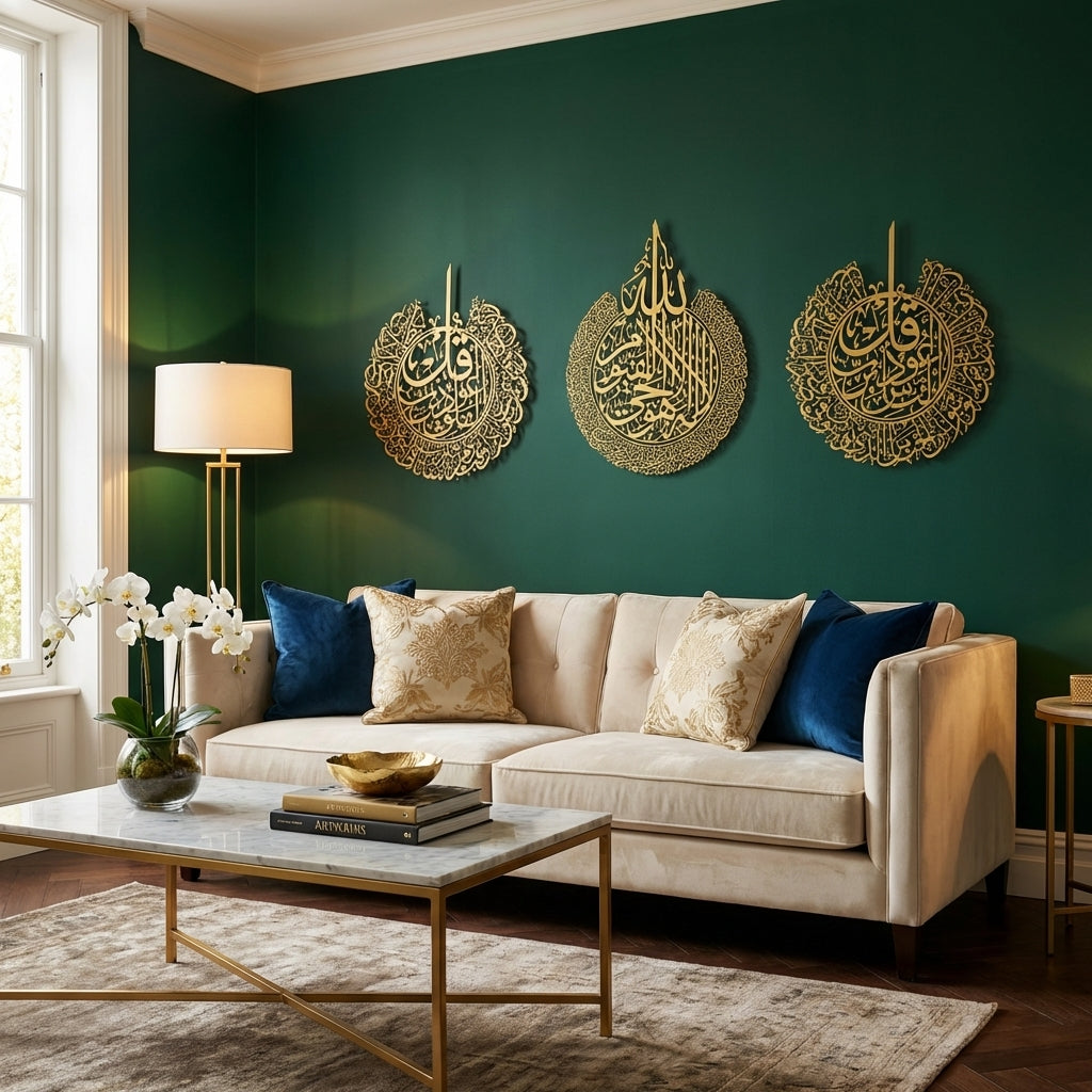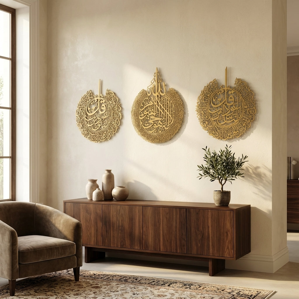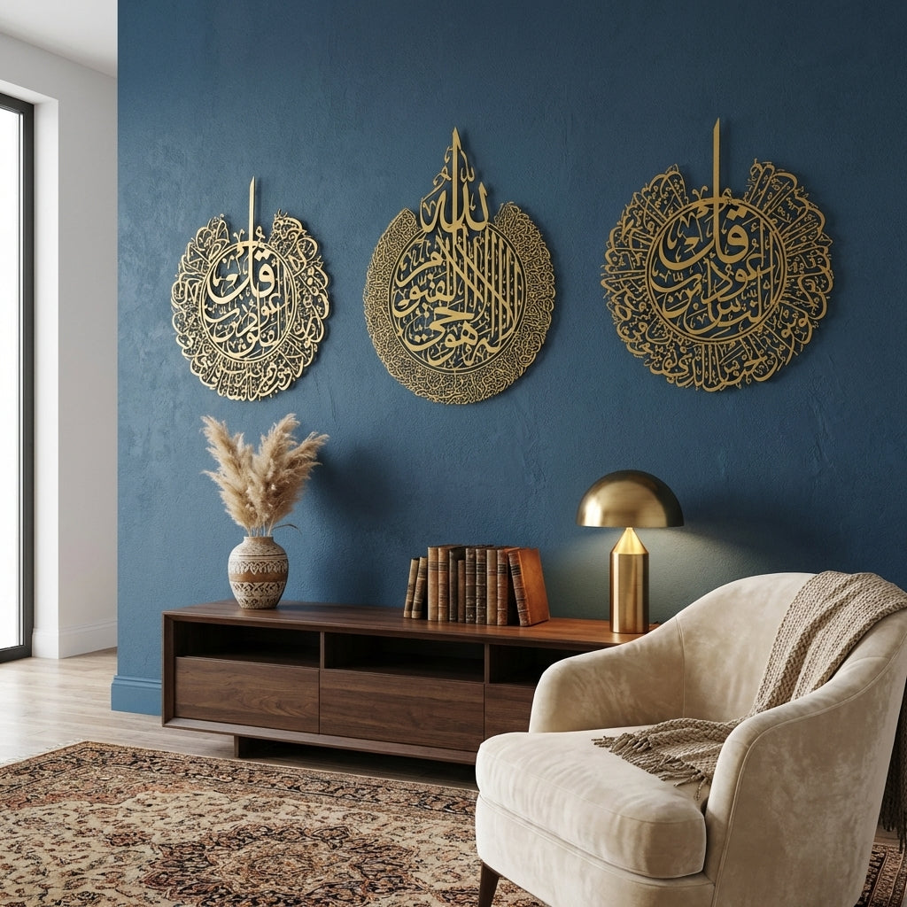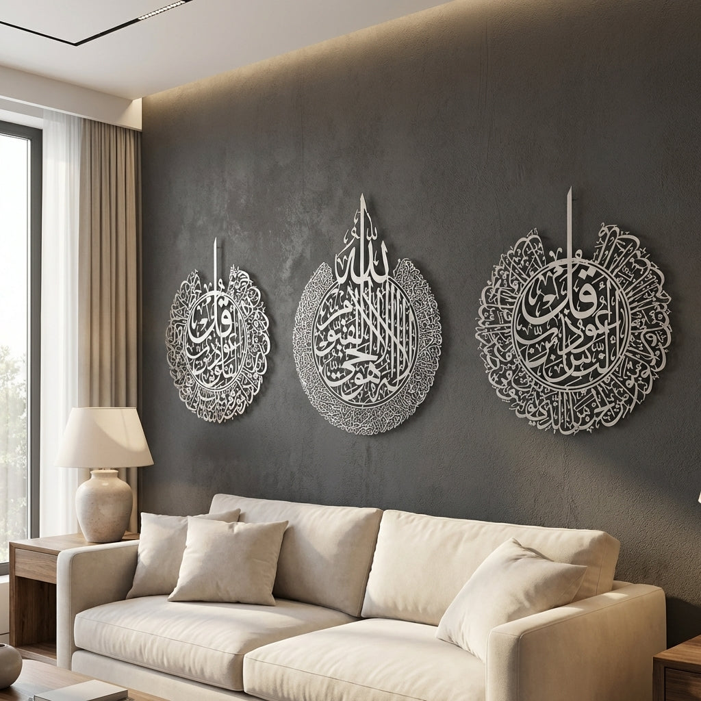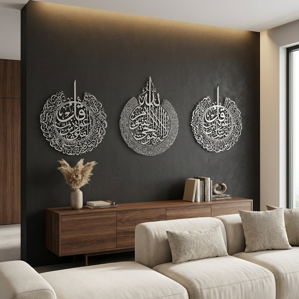 Bu özel 3’lü set, Ayetel Kürsi ile birlikte Felak ve Nas surelerini zarif hat formunda buluşturarak; bulunduğu mekâna iman, korunma ve iç huzuru bir arada taşır. Her parça kendi anlamını taşırken, birlikte kullanıldığında güçlü bir manevi bütünlük oluşturur.