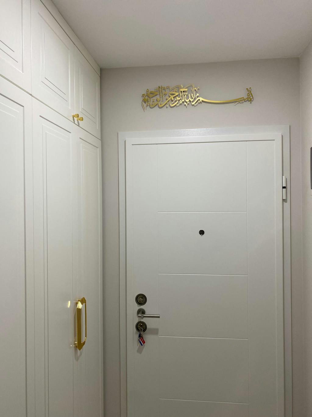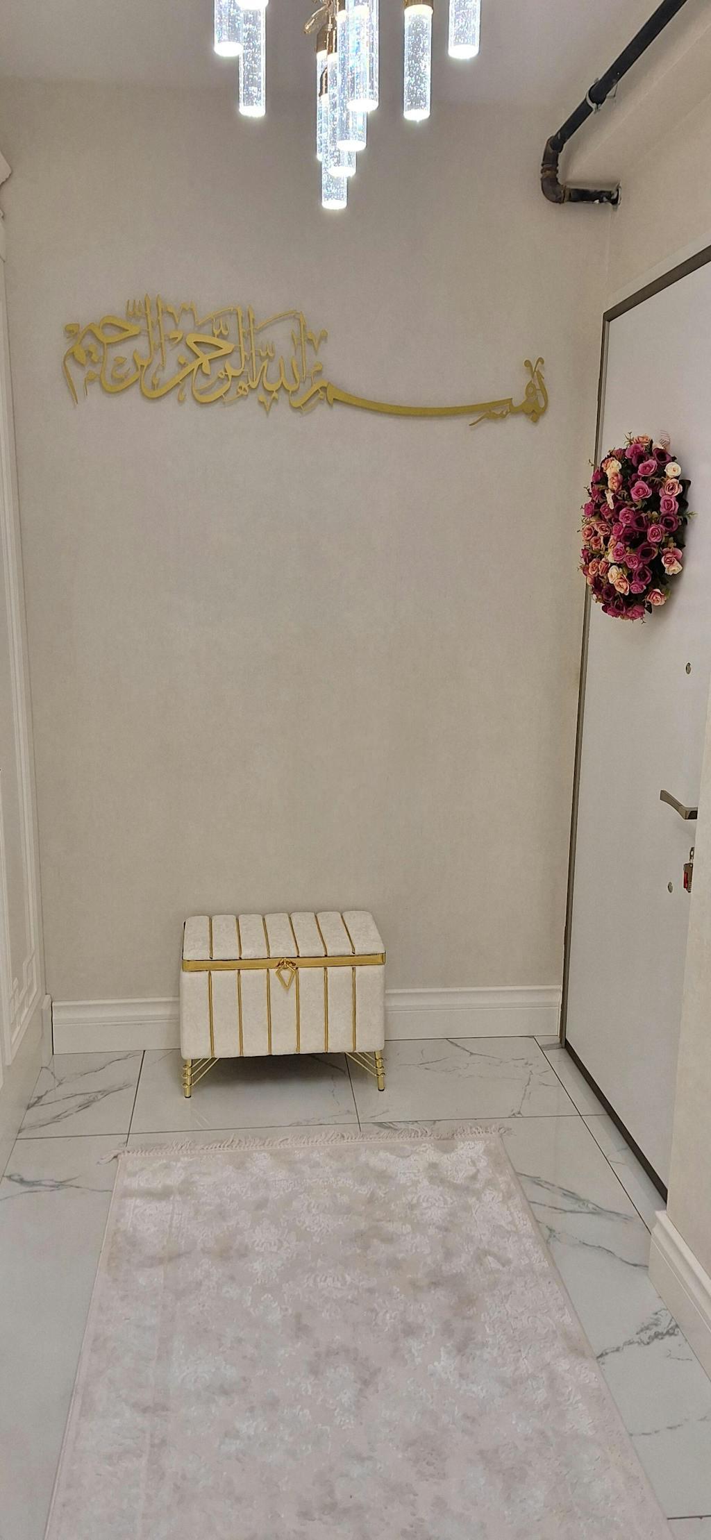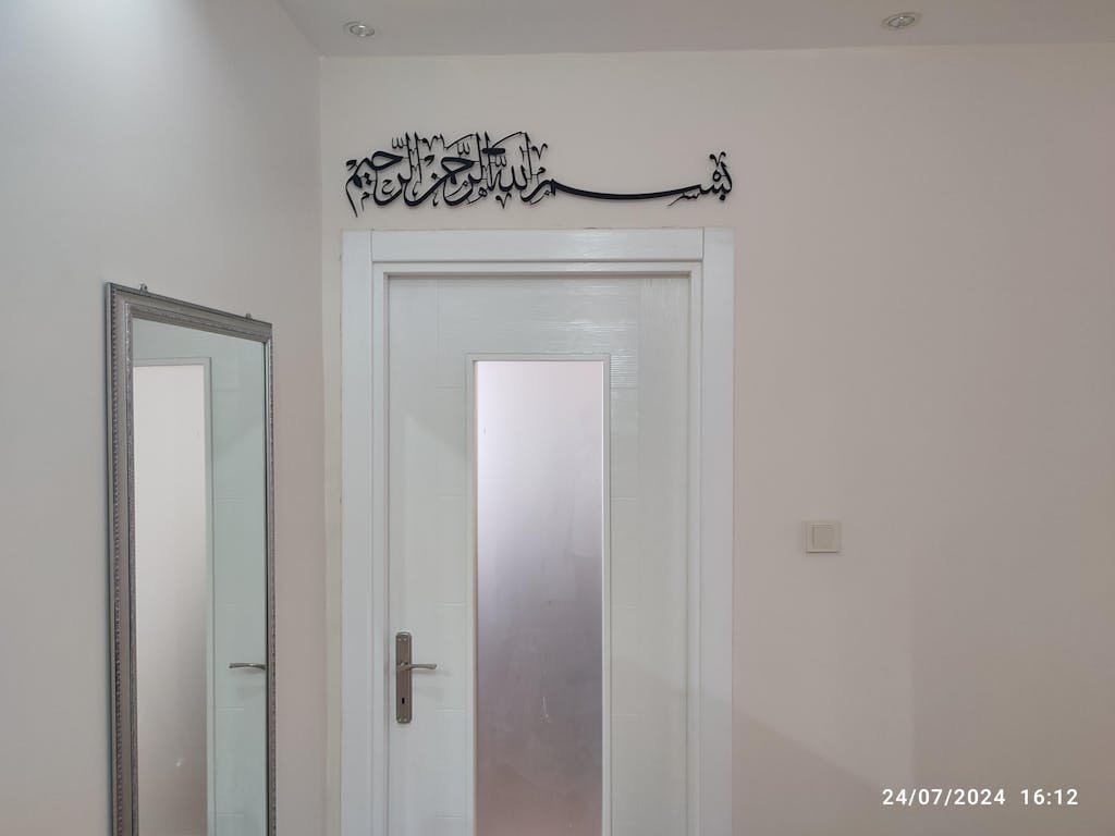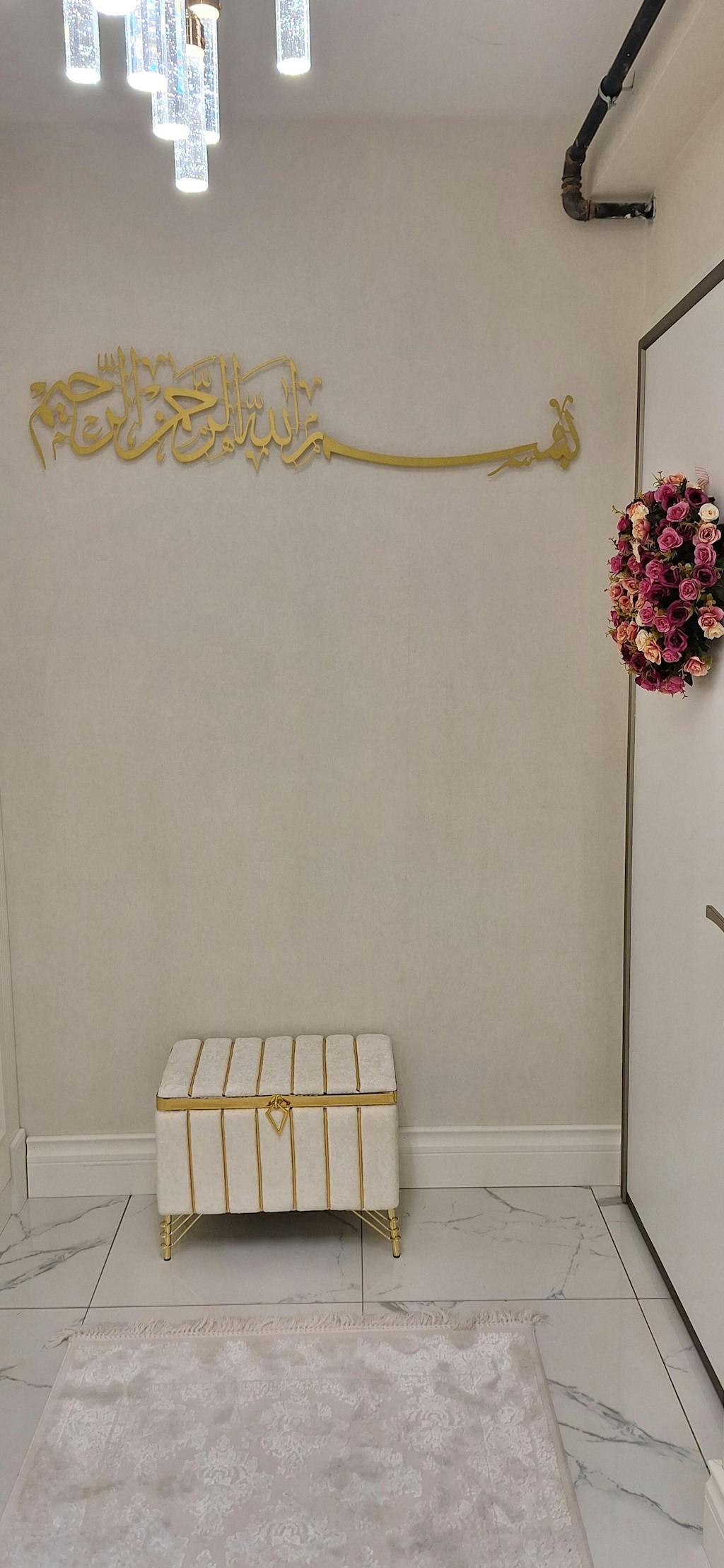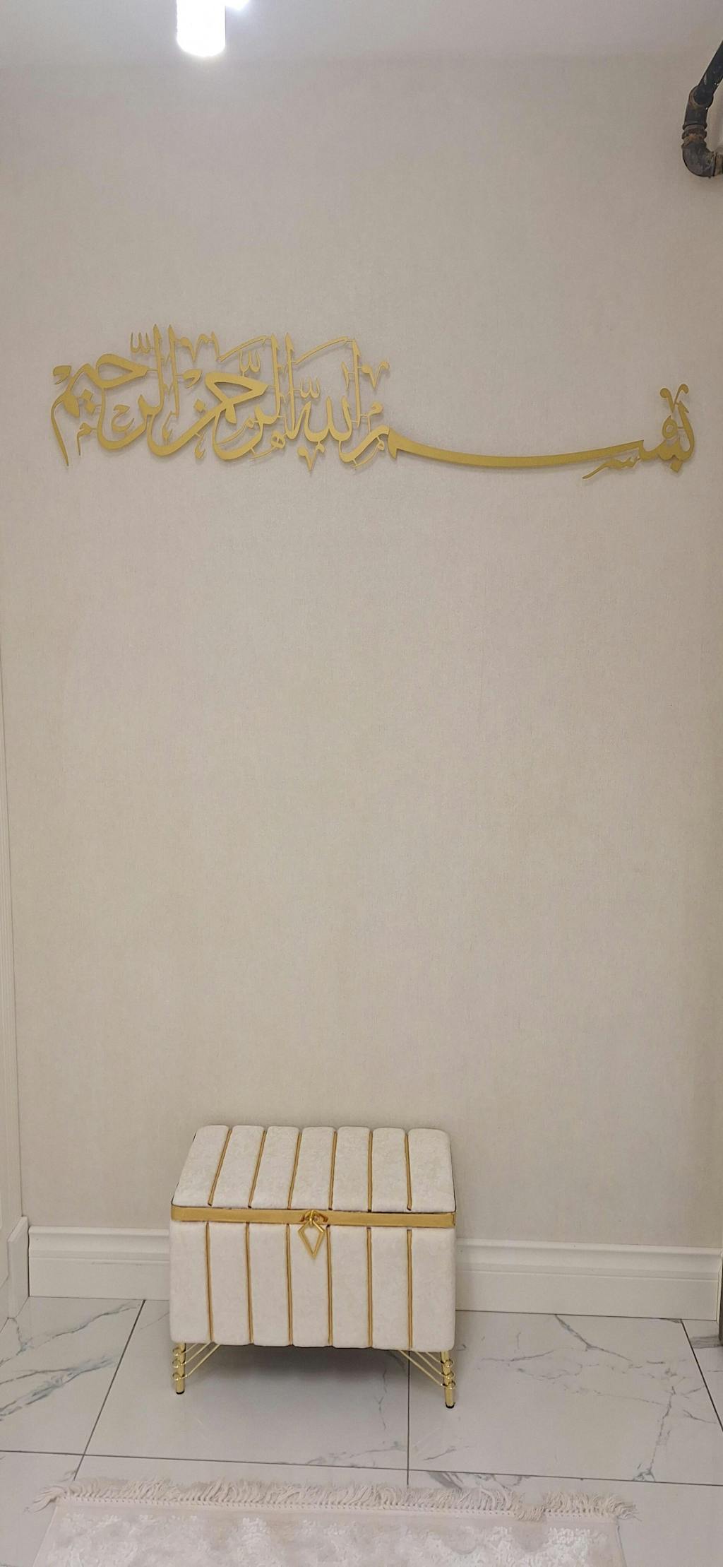 Besmele” hat yazısının zarif metal işçiliğiyle buluştuğu bu duvar tablosu, her işe Allah’ın adıyla başlama niyetini mekâna taşır; yaşam alanında huzur, bereket ve bilinçli bir başlangıç duygusu yaratır.