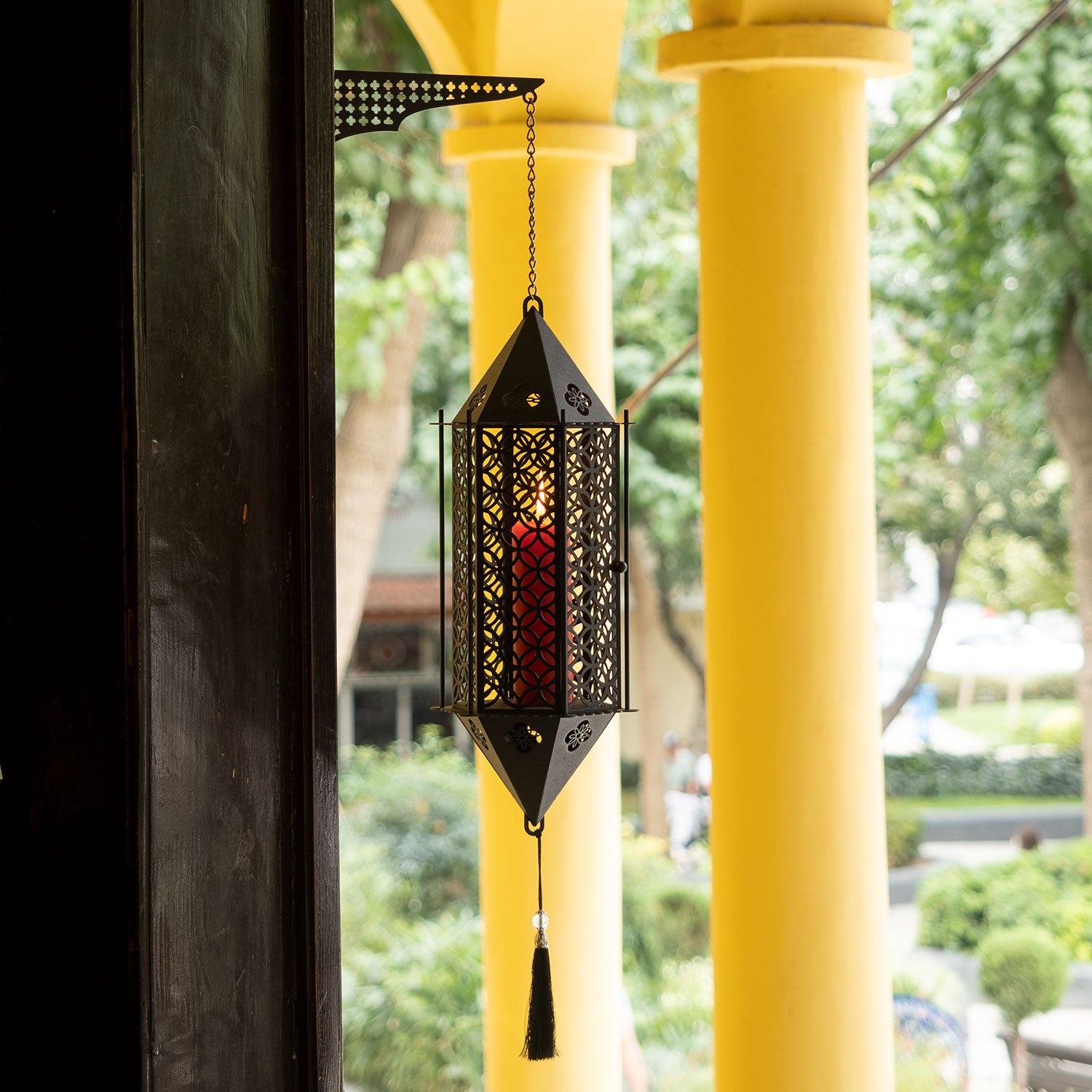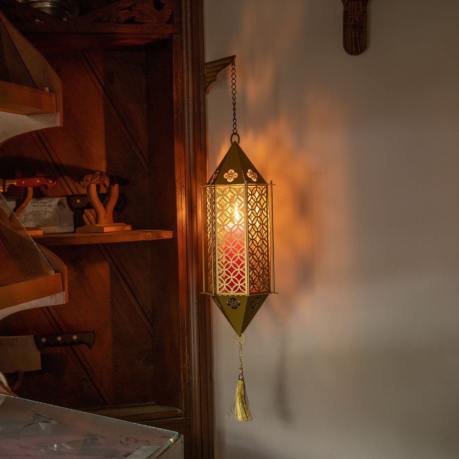 Duvara asılan bu metal mumluk, ışığıyla evinize huzur ve manevi bir sükûnet taşır; pencere veya kapı kenarına yerleştirildiğinde hem dekoratif dokunuş sağlar hem de sıcak bir atmosfer oluşturur.