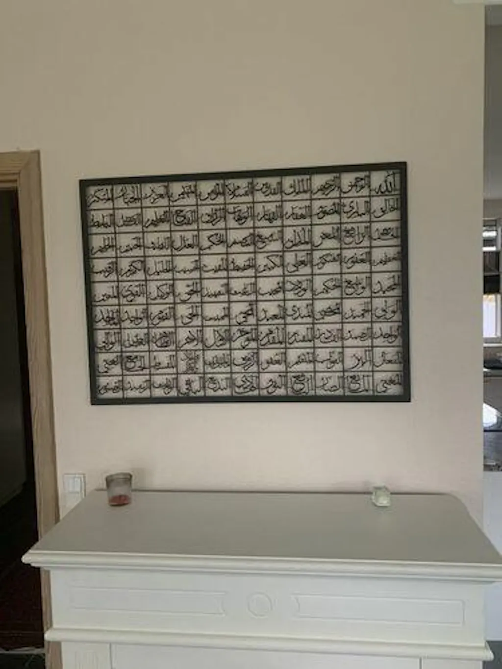 Allah’ın 99 isminin (Esma-ül Hüsna) metal işçiliğiyle hayat bulduğu bu duvar tablosu, mekâna iman, merhamet ve ilahi sıfatların huzurunu taşır; her bakışta Rabbimizin isimleriyle derin bir farkındalık ve sükûnet hissi sunar.