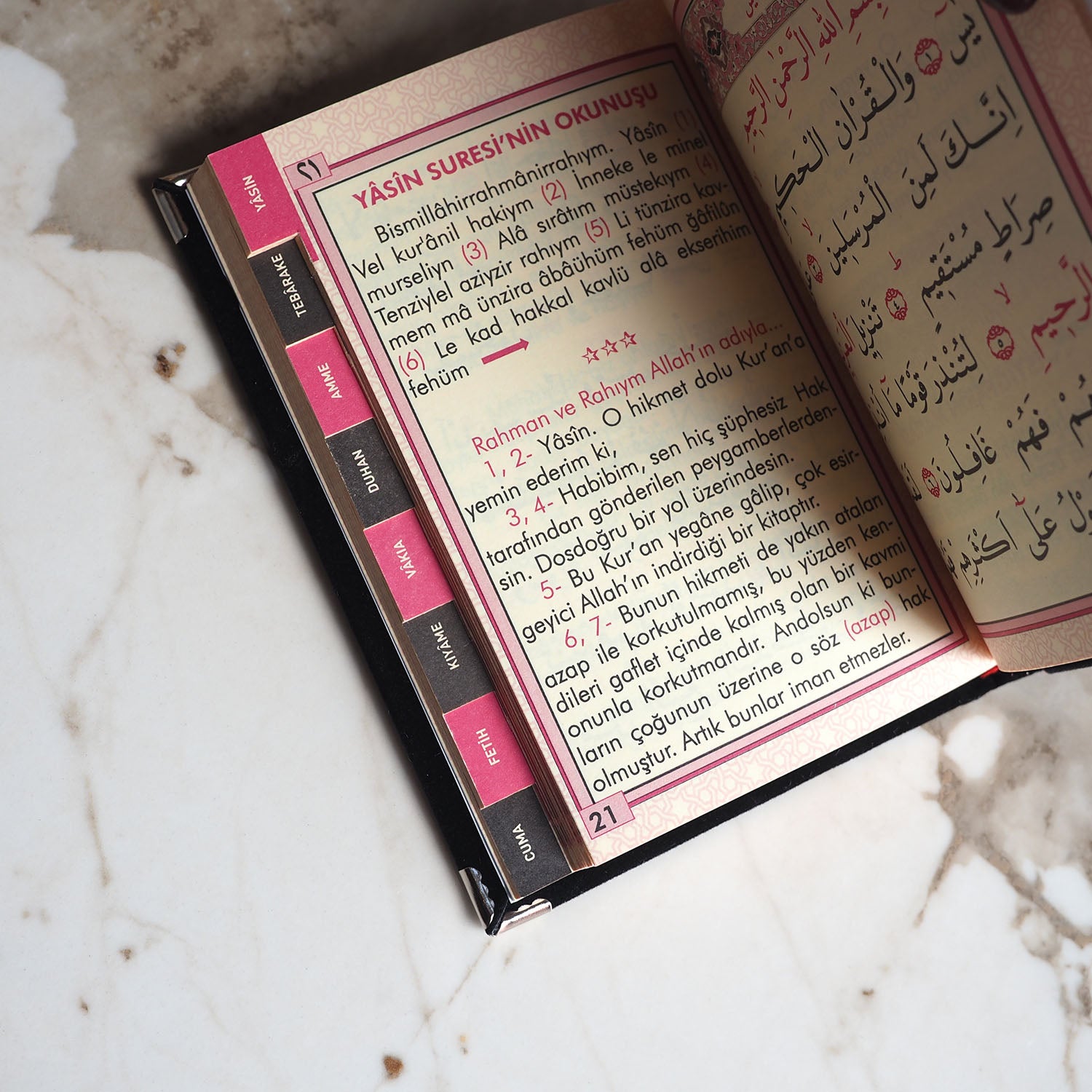 Amener Resûlü, Yasin, Fetih, Vakıa, Tebareke gibi kıymetli surelerin yanı sıra, bağışlanma, bereket ve huzur dualarını da içerir.