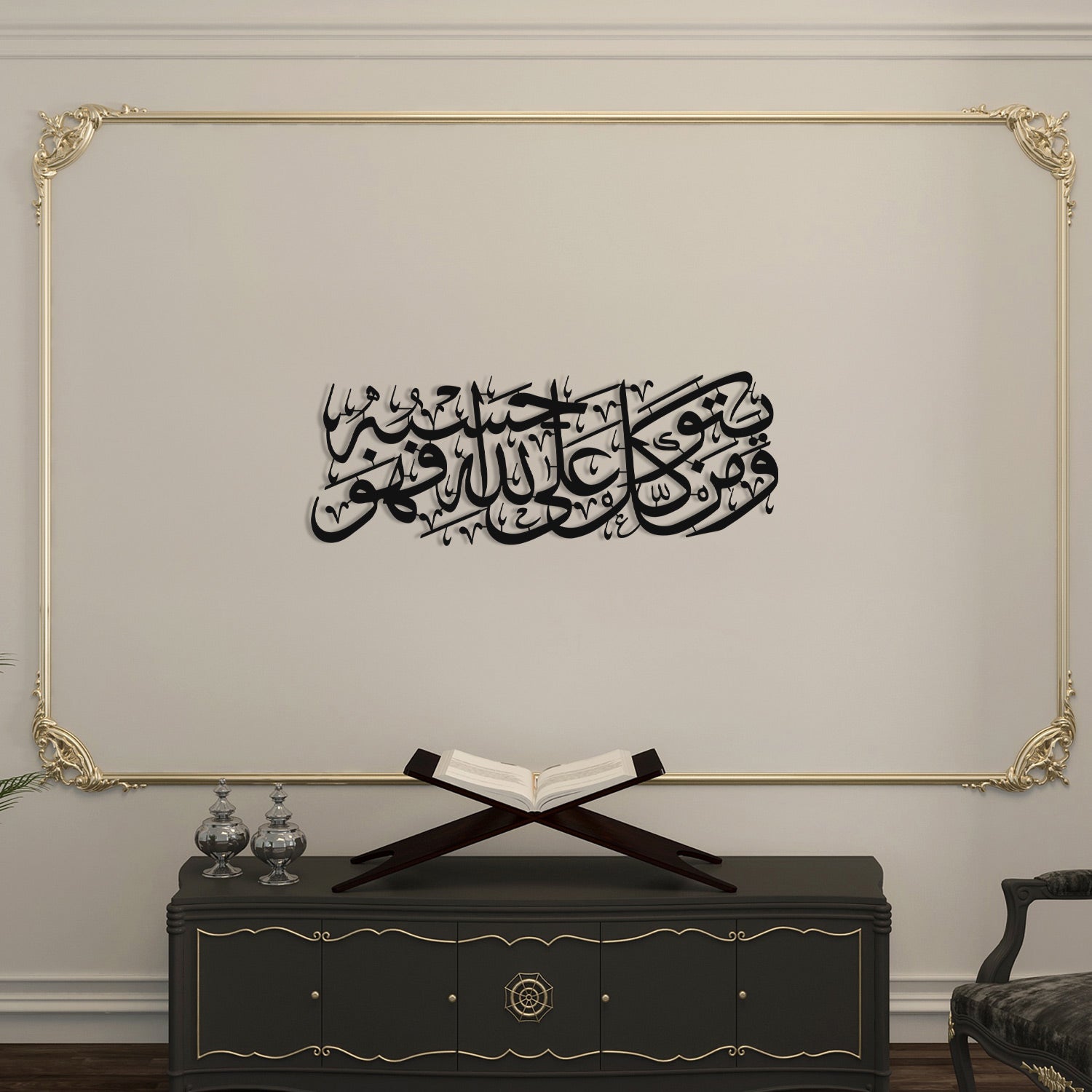 Bu özel tasarım metal duvar tablosu, Talak Suresi 3. Ayetinin ilham verici anlamını zarif hat sanatıyla birleştiriyor.